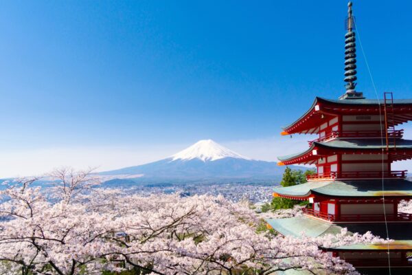 山梨県富士吉田市にある新倉山浅間公園は、富士山と五重塔(忠霊塔)、満開の桜が一度に見られる絶景スポットとして、世界中から観光客が訪れる人気の観光地です。特に春の桜シーズンには、国内外から多くの観光客が押し寄せ、その美しい景色をカメラに収めようとする人々で賑わいます。